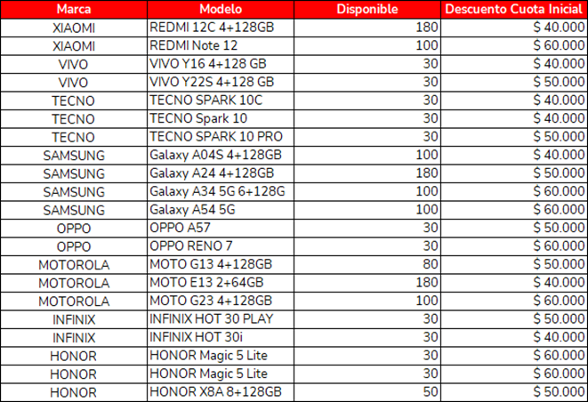 - En el siguiente cuadro se relacionan los equipos participantes de la oferta y el descuento en la cuota inicial.